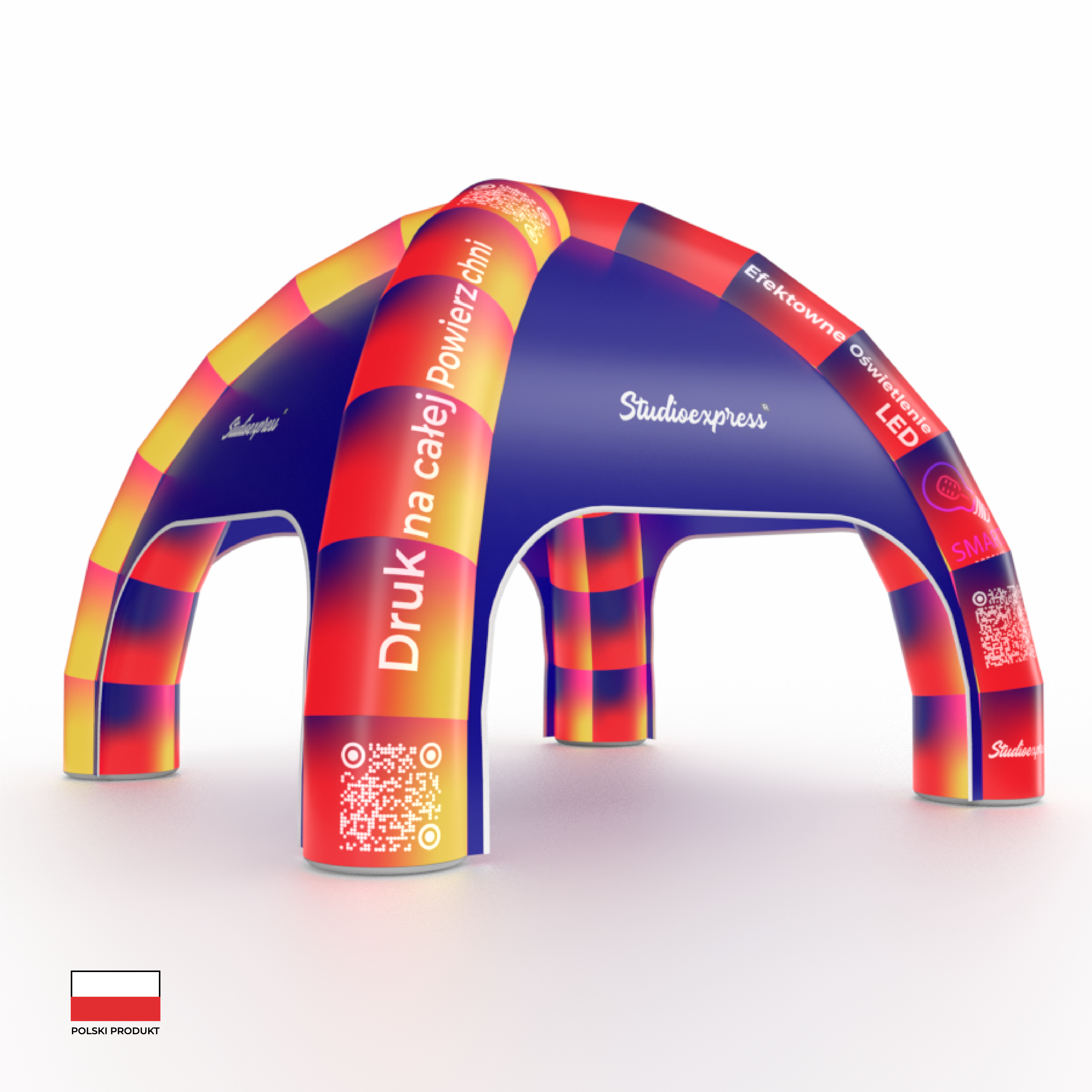 Zobacz, jak Namiot Pająk Bokochód z pełnym zadrukiem wypełnia pustą przestrzeń. Każdy centymetr poszycia – od dachu po nogi – to miejsce na Twoje logo, grafikę czy hasło reklamowe. Dzięki sublimacji nie ograniczamy Cię do prostych napisów; możesz przenieść na namiot skomplikowane zdjęcia i gradienty.