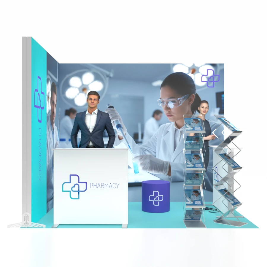 Stoisko Targowe Multi Pharmacy Led w układzie L ma otwarta ekspozycję i naturalnie rozdziela przestrzeń rozmów. Lekkie elementy z podświetlanymi ramami LED wzmacniają czytelność grafiki i utrzymują spójny, estetyczny wygląd. Konstrukcja składa się bez narzędzi, dzięki czemu montaż na miejscu jest prosty i szybki, a całość wygląda profesjonalnie od pierwszej minuty. Idealne rozwiązanie, gdy potrzebujesz otwartego punktu do kontaktu z odwiedzającymi w narożnym ustawieniu.